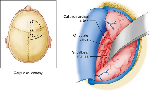 Incisions are made in the top of the skull to remove a flap of bone, exposing the brain. The outer covering is cut, and the two hemispheres are pulled slightly apart to expose the corpus callosum. The fibers of the corpus callosum are cut, taking care to avoid nearby arteries and ventricles (fluid-filled cavities in the brain).