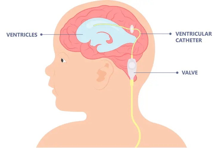 A valve (fluid pump) is placed underneath the skin behind the ear. The valve is attached to both catheters. When extra pressure builds up around the brain, the valve opens, and excess fluid drains out of it into the belly or chest area. This helps decrease intracranial pressure.