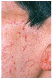 • Telangiectases on the tongue, lips, nasal mucosa, face, ears, fingertips, nails, whites of the eyes, and skin (they may bleed easily)