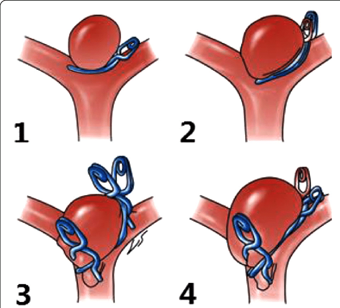 The treatment decision for observation, surgical clipping or bypass, or endovascular coiling largely depends on the aneurysm’s size, location, and neck geometry. The less invasive nature of coiling is likely to be favored in patients who are older, are in poor health, have serious medical conditions, or have aneurysms in certain locations. In patients younger than 40 years of age, the difference in the safety between coiling versus clipping is small. Therefore, the better long-term protection from bleeding may give patients with clipped aneurysms an advantage in life expectancy